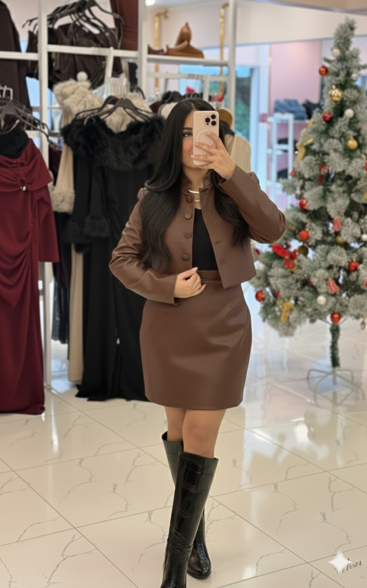Chic Espresso Faux-Leather Cropped Jacket & Mini Skirt Co-ord Set