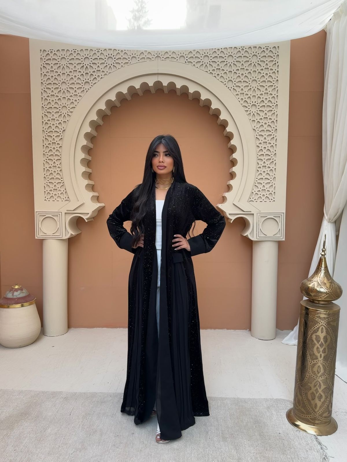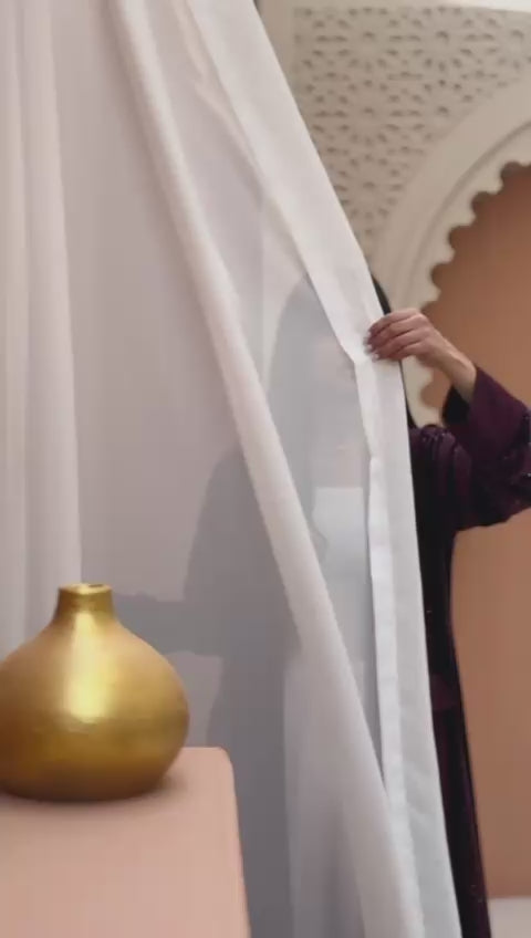 Embrace the sacred season with audacious elegance. This pleated Ramadan abaya commands attention with its mesmerizing midnight hue that shimmers with every movement, catching light in unexpected ways. The thoughtfully crafted pleats add dimension and graceful flow, allowing you to move with confidence and poise. Perfect for those who refuse to compromise between tradition and bold personal style, this piece transforms modest wear into a statement of refined sophistication. Celebrate Ramadan in a design that's as fearless as it is faithful.