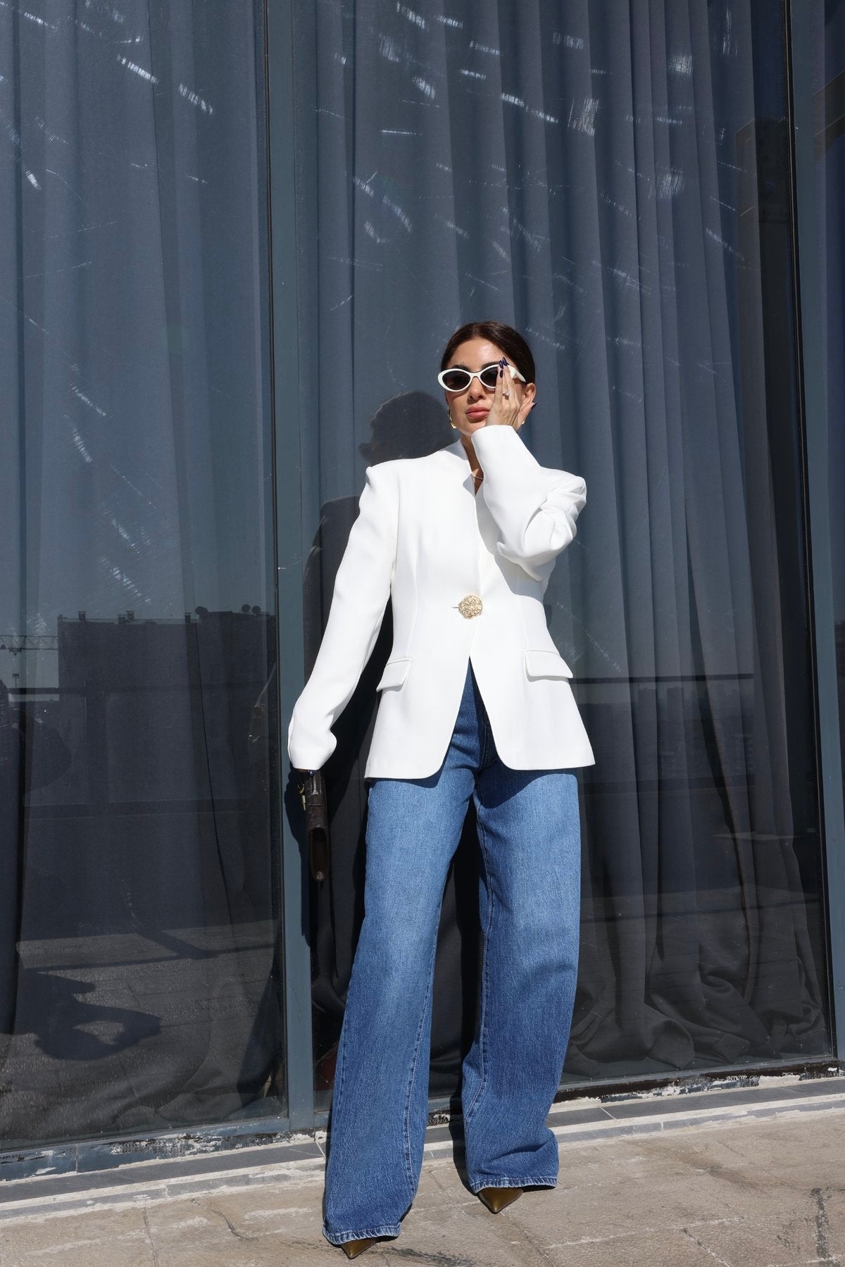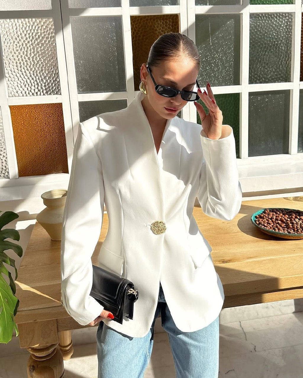 Elevate your style with this chic blazer featuring eye-catching gold button details. Perfect for adding a touch of sparkle to any outfit, it blends classic tailoring with a fun, glamorous twist. Whether you're dressing up for a night out or adding flair to your everyday look, this blazer brings confidence and charm to your wardrobe.