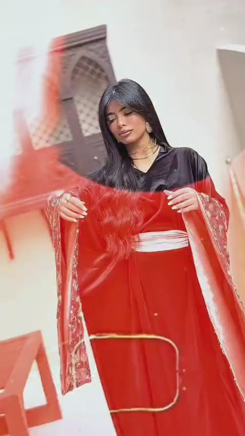 Embrace bold elegance this Ramadan with our striking kaftan that commands attention. Crafted from luxurious black velvet, this piece features dazzling pink sequins that catch the light with every movement, creating an unforgettable shimmer. The rich velvet base provides sophisticated depth while the sequin embellishments add fearless glamour. Perfect for evening celebrations and special occasions, this kaftan lets you celebrate in style without compromising on comfort. Make a statement that's unmistakably yours.